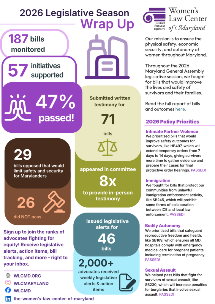 During the Maryland General Assembly (MDGA) legislative session this year, WLC monitored 187 pieces of legislation, provided written testimony on 71 bills, appeared in committee 8 times to provide in-person testimony, and sent out weekly legislative alerts and action items for 46 bills. Of the bills we supported this session, 47% passed!